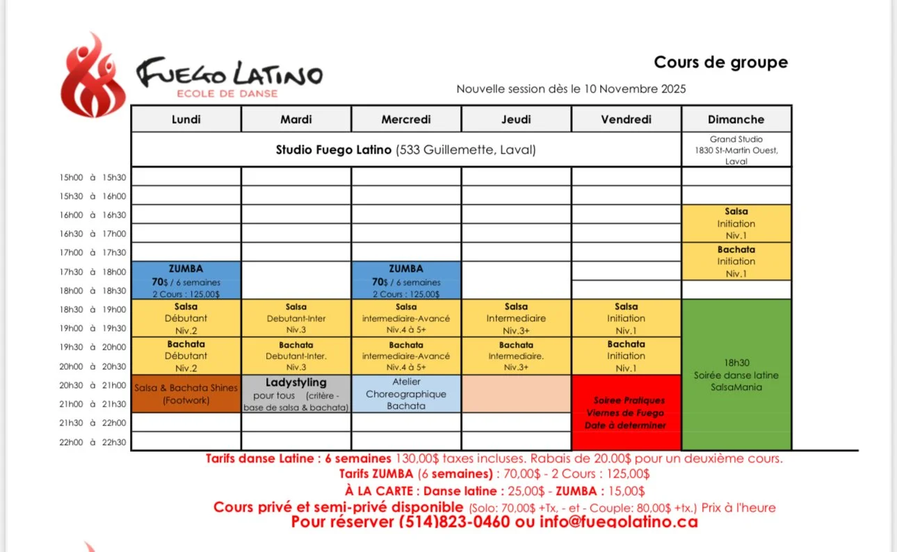 C’est dans une ambiance chaleureuse et décontractée que l’école de danse latine Fuego Latino vous transmettra sa passion pour la salsa, la bachata, le cha cha cha, le merengue, la kizomba, Zumba et plus encore. Réputée pour son ambiance « caliente » ainsi que sa grande qualité de cours, Fuego Latino se distingue à Laval.